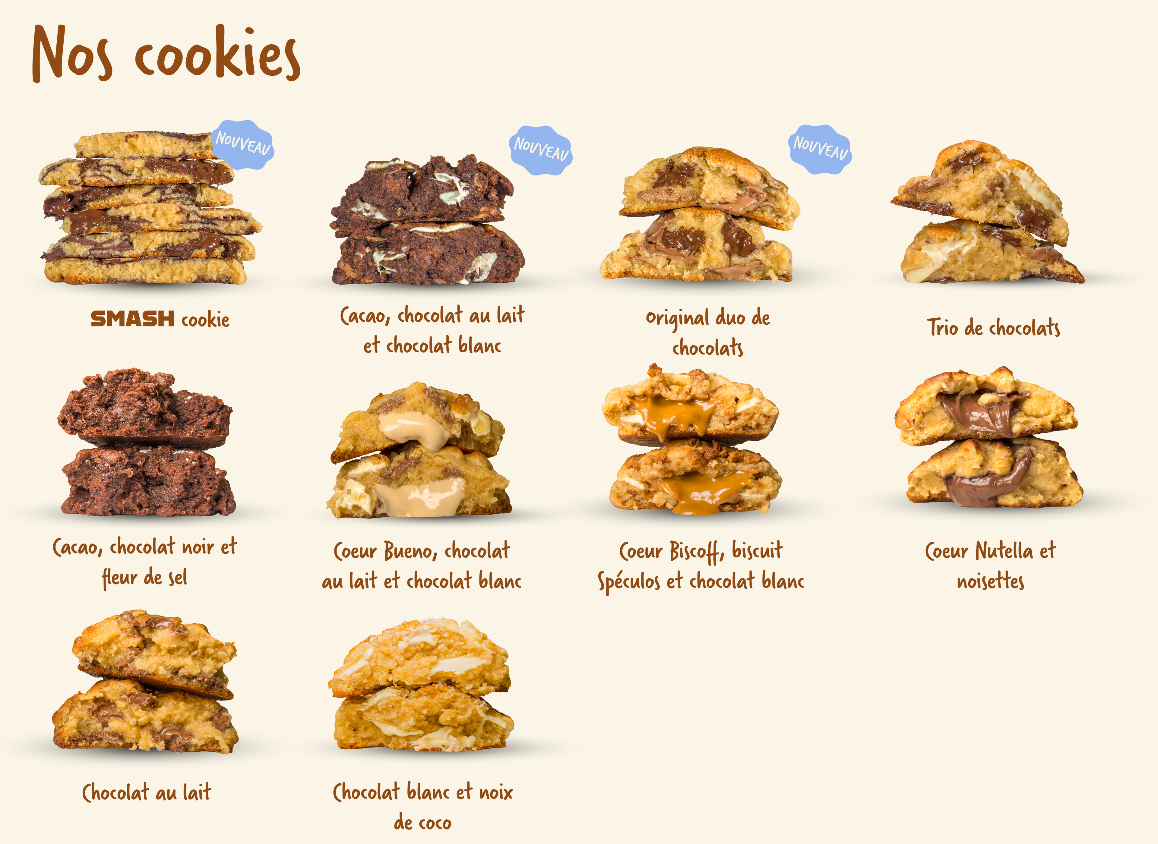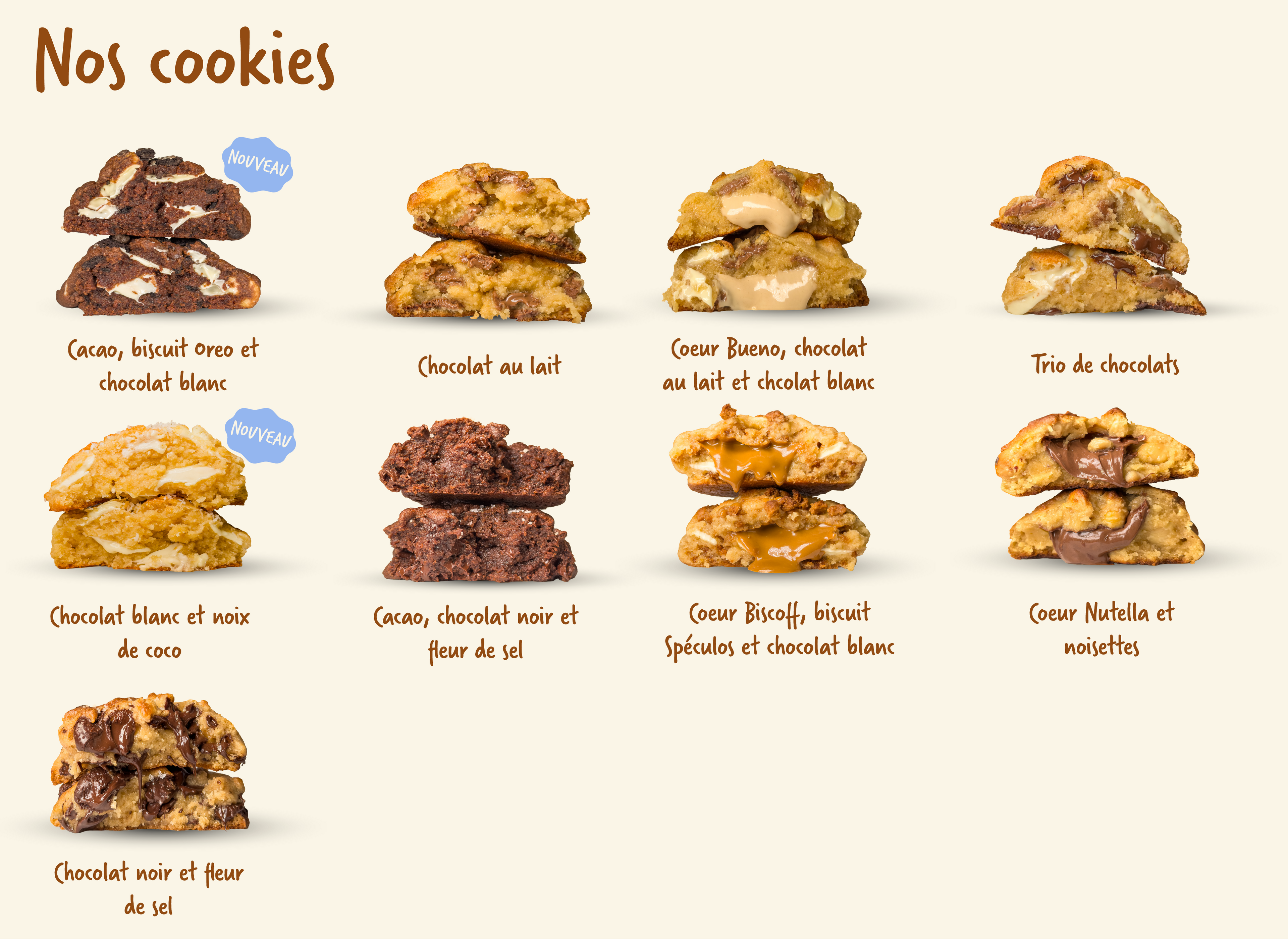 Croustillants à l'extérieur, fondants à l'intérieur, chaque cookie est façonné à la main avec soin dans notre atelier.